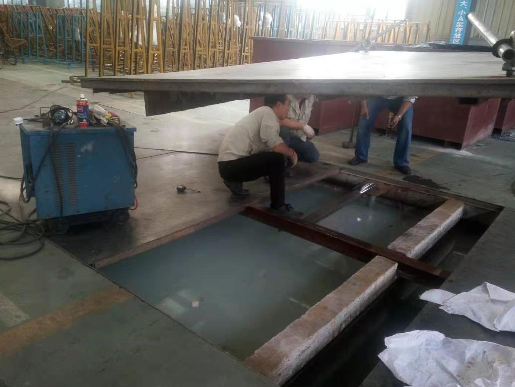 圖為谷文專在修理洗磨三級沉淀凈化蓄水池蓋板 | |